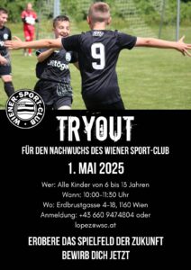 Du bist zu jung für die U14-U17? Kein Problem. Am 1. Mai findet ein Sichtungstraining für den Nachwuchs des Wiener Sport-Club statt: Hier werden alle Kinder von 6-13 Jahren gesucht. Anmeldung via +43 660 9474804 oder lopez@wsc.at! Alle Infos zu den Tryouts findest du auf den Flyers unten.