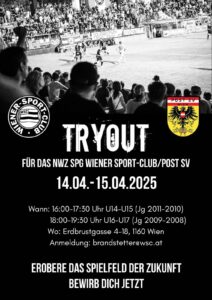 Du möchtest Teil des Nachwuchszentrum-Teams in Kooperation mit dem Post SV werden? Dann melde dich für unser Tryout am 14.4./15.4.2025 an. Schicke einfach ein Mail an brandstetter@wsc.at!